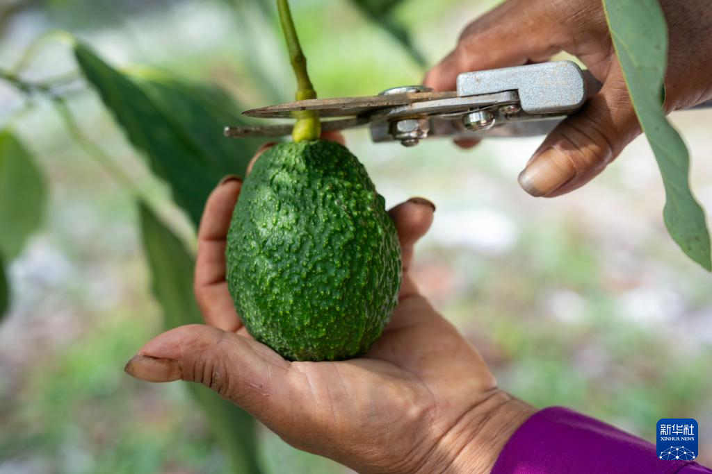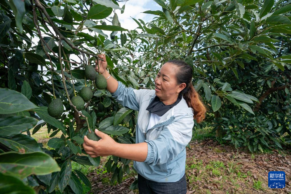 由企業(yè)在當?shù)剞r(nóng)民中培訓的產(chǎn)業(yè)技術(shù)人員李美瓊在一處牛油果種植基地檢查待采的牛油果(10月29日攝)。新華社記者 陳欣波 攝