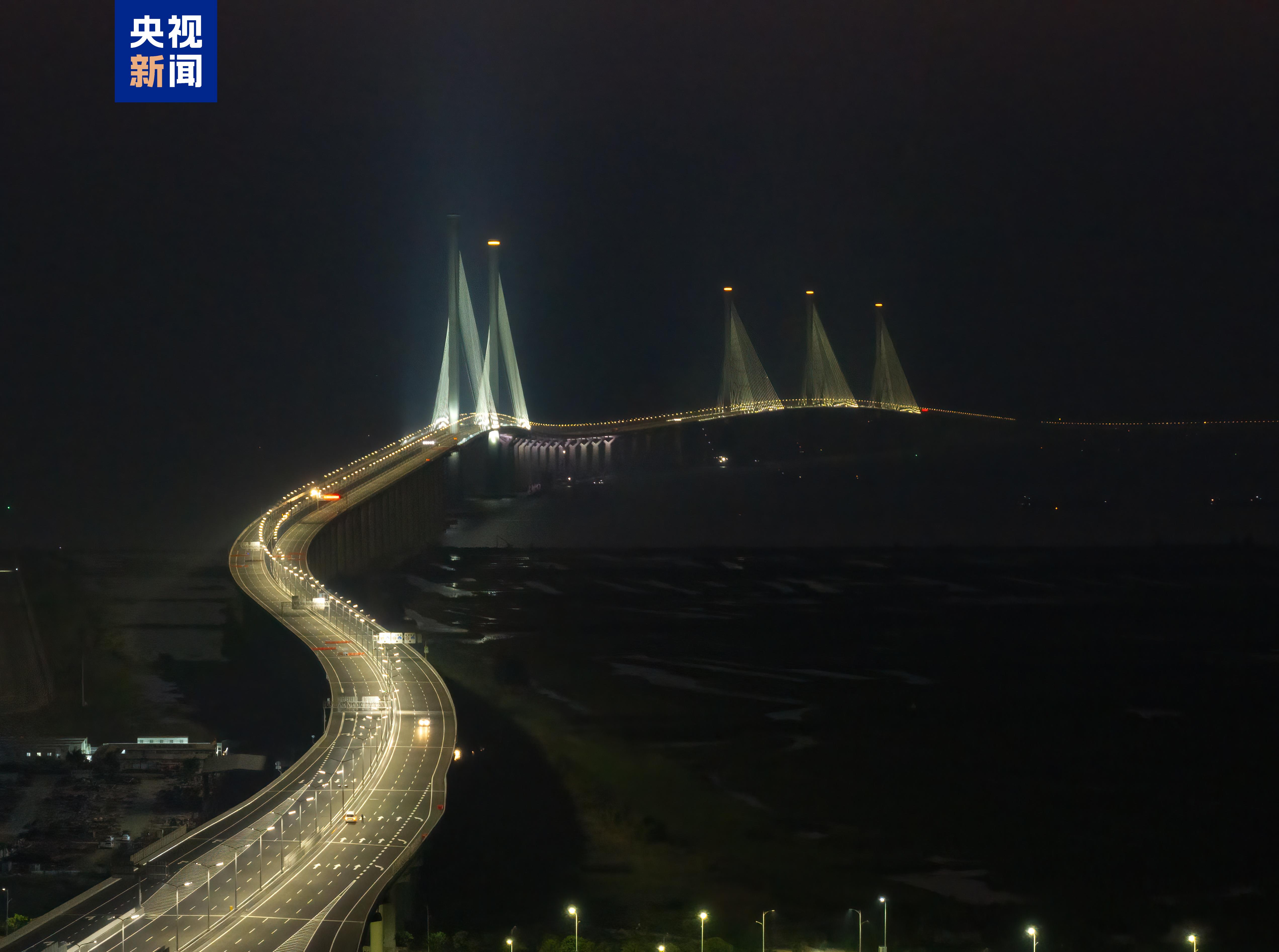 黃茅海跨海通道全線布有路燈和景觀燈。夜幕下,最耀眼的是塔頂,五座“小蠻腰”主塔如同戴上了圓形“王冠”,而一條條被照亮的斜拉索仿佛燈光勾勒出的“芭蕉葉葉脈”。燈光與夜色明暗搭配、突顯出五座“小蠻腰”主塔,形成平靜柔和的照明效果。從遠(yuǎn)處看,黃茅??绾Mǖ婪路鹨粭l珍珠,串聯(lián)起中央的五個“等腰三角形”,萬盞明燈點亮黃茅海,為粵港澳大灣區(qū)打造出一座閃耀的海上地標(biāo)。