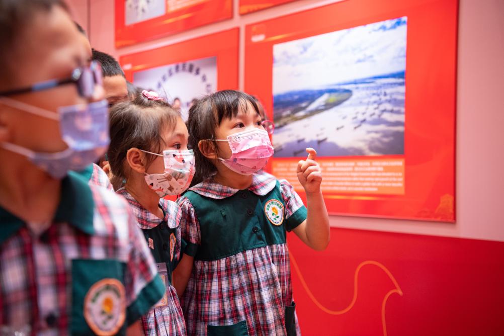 2021年7月12日,小朋友參觀在澳門舉行的“中國共產黨的100年”大型圖片展。新華社記者 張金加 攝
