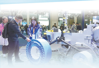 第七屆中國(guó)國(guó)際進(jìn)口博覽會(huì)上,觀眾正在了解米其林月球探測(cè)車輪胎?!√?克攝