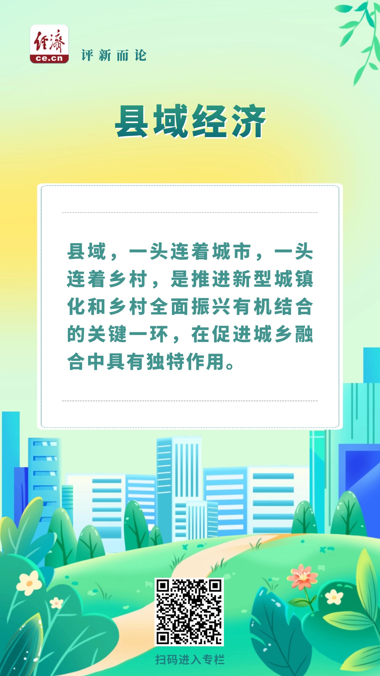 縣域,一頭連著城市,一頭連著鄉(xiāng)村,是推進(jìn)新型城鎮(zhèn)化和鄉(xiāng)村全面振興有機(jī)結(jié)合的關(guān)鍵一環(huán),在促進(jìn)城鄉(xiāng)融合中具有獨(dú)特作用。因此,發(fā)展壯大縣域經(jīng)濟(jì),還要把縣域發(fā)展納入城鄉(xiāng)融合、區(qū)域協(xié)調(diào)發(fā)展的大格局中。在完善自身基礎(chǔ)設(shè)施建設(shè)、提高公共服務(wù)水平的過程中,縣域要充分發(fā)揮連接城鄉(xiāng)發(fā)展的“橋梁”作用,不僅讓各類優(yōu)勢資源、公共服務(wù)從城市逐步向鄉(xiāng)村延伸,也讓越來越多的美麗鄉(xiāng)村被發(fā)掘和點(diǎn)亮。