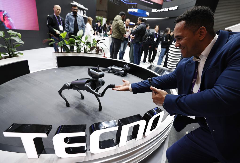 2024年2月26日,在西班牙巴塞羅那舉行的2024年世界移動(dòng)通信大會(huì)上,人們參觀傳音旗下的TECNO展臺(tái)。新華社記者高靜攝