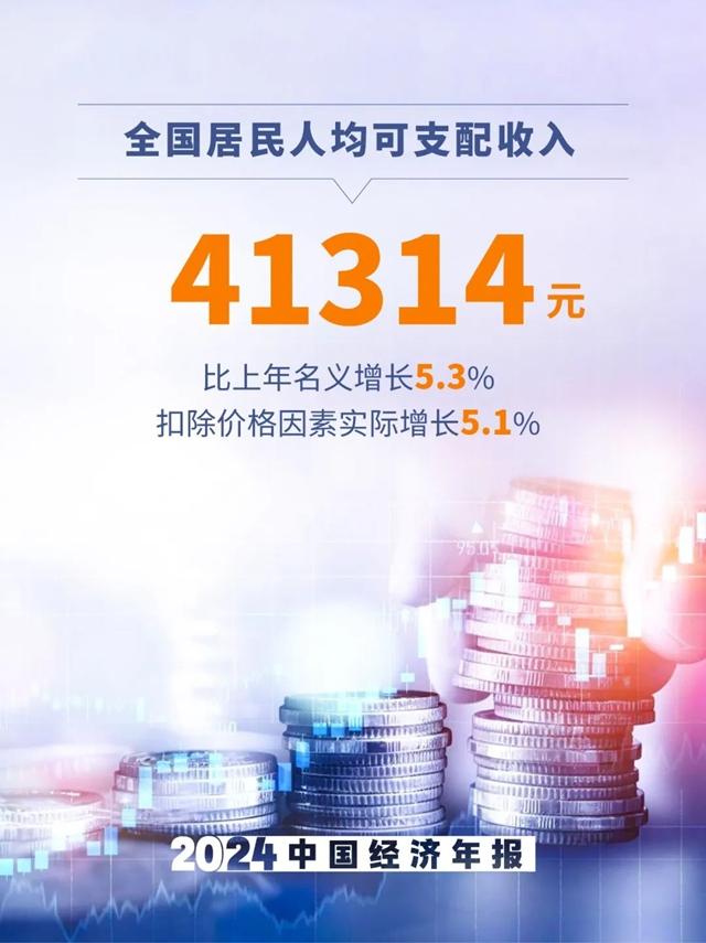 10、全國居民人均可支配收入41314元,比上年名義增長5.3%,扣除價格因素實際增長5.1%。