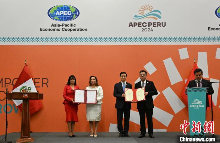 2024年11月15日,亞太經(jīng)合組織第三十一次領(lǐng)導(dǎo)人非正式會議期間,中國香港與秘魯在秘魯利馬簽署自由貿(mào)易協(xié)定。圖為秘魯總統(tǒng)博魯阿爾特(左二)、秘魯外貿(mào)旅游部部長萊昂(左一)、香港特區(qū)行政長官李家超(右三)、香港特區(qū)政府商務(wù)及經(jīng)濟(jì)發(fā)展局局長丘應(yīng)樺(右二)完成簽署后合影。 香港特區(qū)政府新聞處供圖