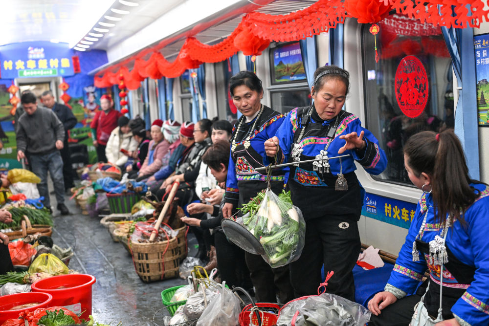 1月18日,在5640次列車上,乘客在“鄉(xiāng)村集市”車廂購(gòu)買蔬菜。新華社發(fā)(余天英 攝)