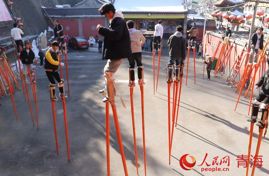 綁蹺、試蹺、定蹺……青海省西寧市湟中區(qū)魯沙爾鎮(zhèn)火神廟,魯沙爾高蹺隊(duì)迎來了春節(jié)前最后一次排練?!皬呐D月初一到現(xiàn)在二十多天了,今年大家積極性很高,報(bào)名的人也多,排練效果不錯(cuò)?!弊龊脺?zhǔn)備,隨著社火音樂的鼓點(diǎn)舞動(dòng)起來,魯沙爾鎮(zhèn)高蹺協(xié)會(huì)會(huì)長李玉龍站在臺(tái)階上看著排練隊(duì)形。