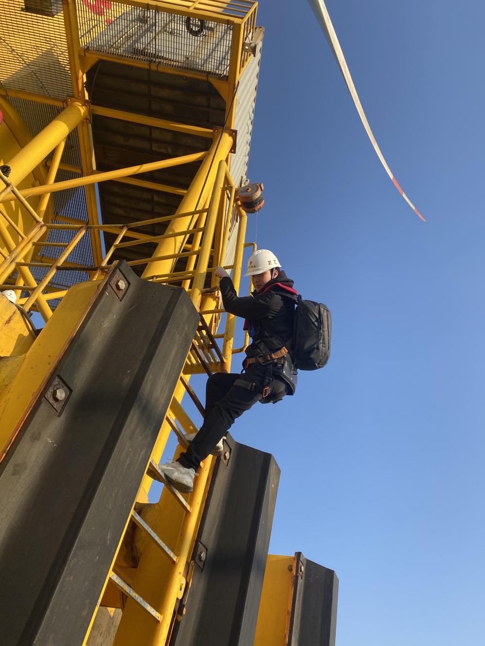 爬上數(shù)十米高的風(fēng)機進行檢修