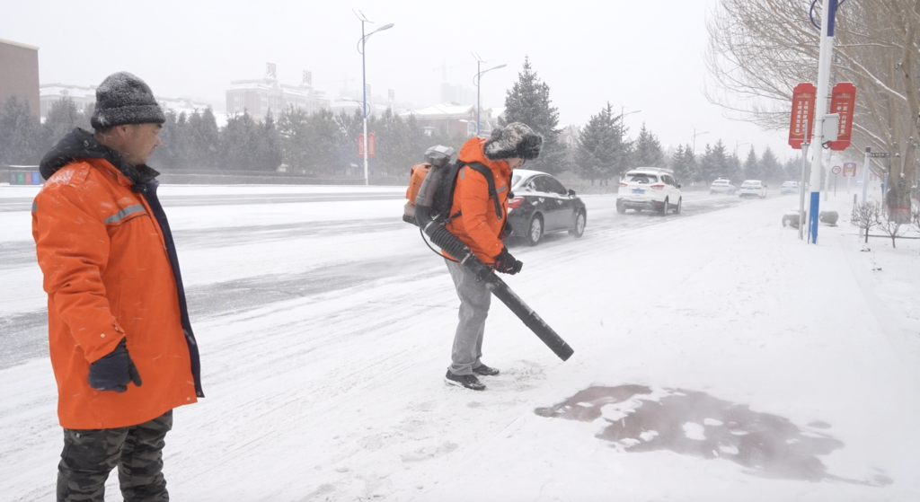 雪越下越厚,風(fēng)機已難以應(yīng)對。王師傅遞來一把鐵鏟說:“要注意,不要直來直去地鏟,而是要斜著發(fā)力,這樣一次能鏟更多雪,也不容易刮壞地面的紋路。”
