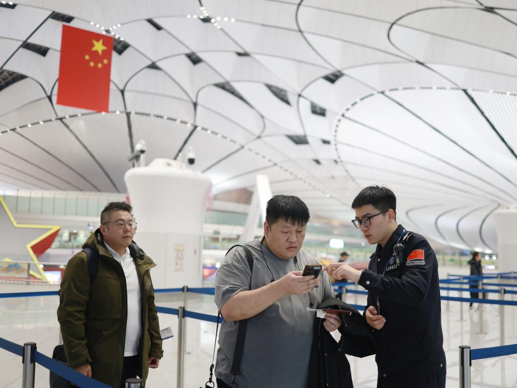 北京大興機(jī)場(chǎng)邊檢站迎來客流高峰,民警們24小時(shí)輪流執(zhí)勤,保障旅客平安順暢通關(guān)。