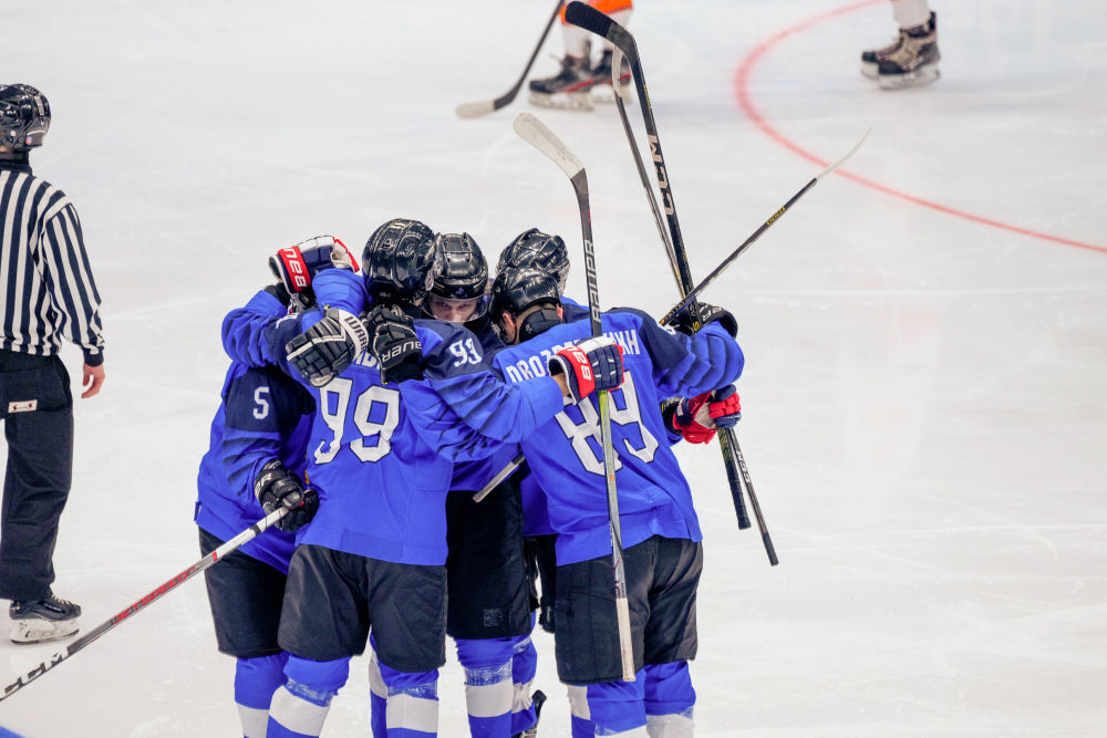 2月3日,科威特冰球隊(duì)球員在比賽中慶祝進(jìn)球。新華社記者 王建威 攝