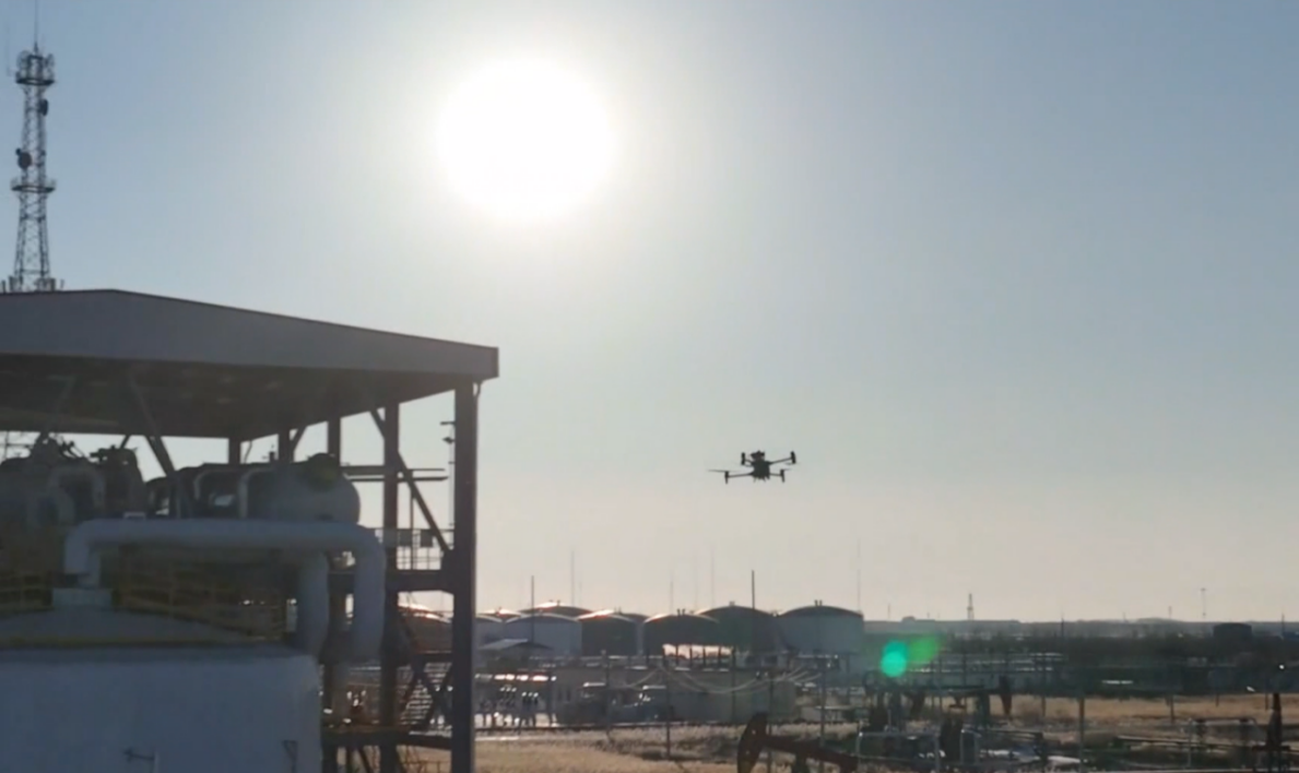 在遼河油田歡喜嶺采油廠,無人機(jī)正按照預(yù)定路線巡檢電熱熔鹽儲(chǔ)能注汽試驗(yàn)站。張子涵攝