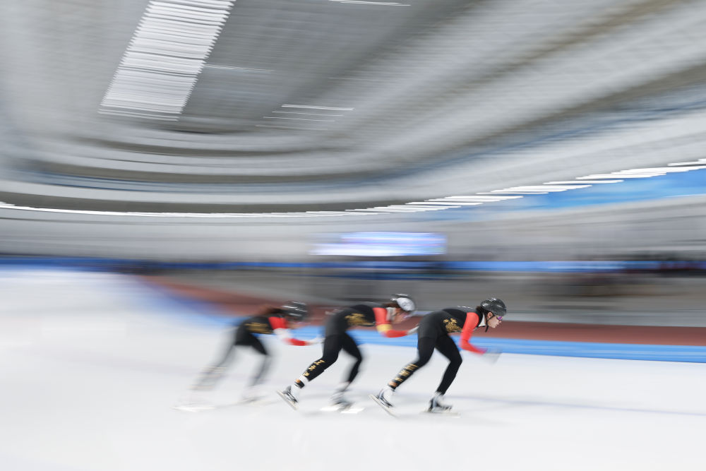 2024年12月15日,黑龍江省冰上訓(xùn)練中心二隊選手在比賽中。當(dāng)日,2024-2025賽季中國杯速度滑冰精英聯(lián)賽第四站暨亞冬會測試賽女子團(tuán)體追逐比賽在黑龍江省冰上訓(xùn)練中心舉行。