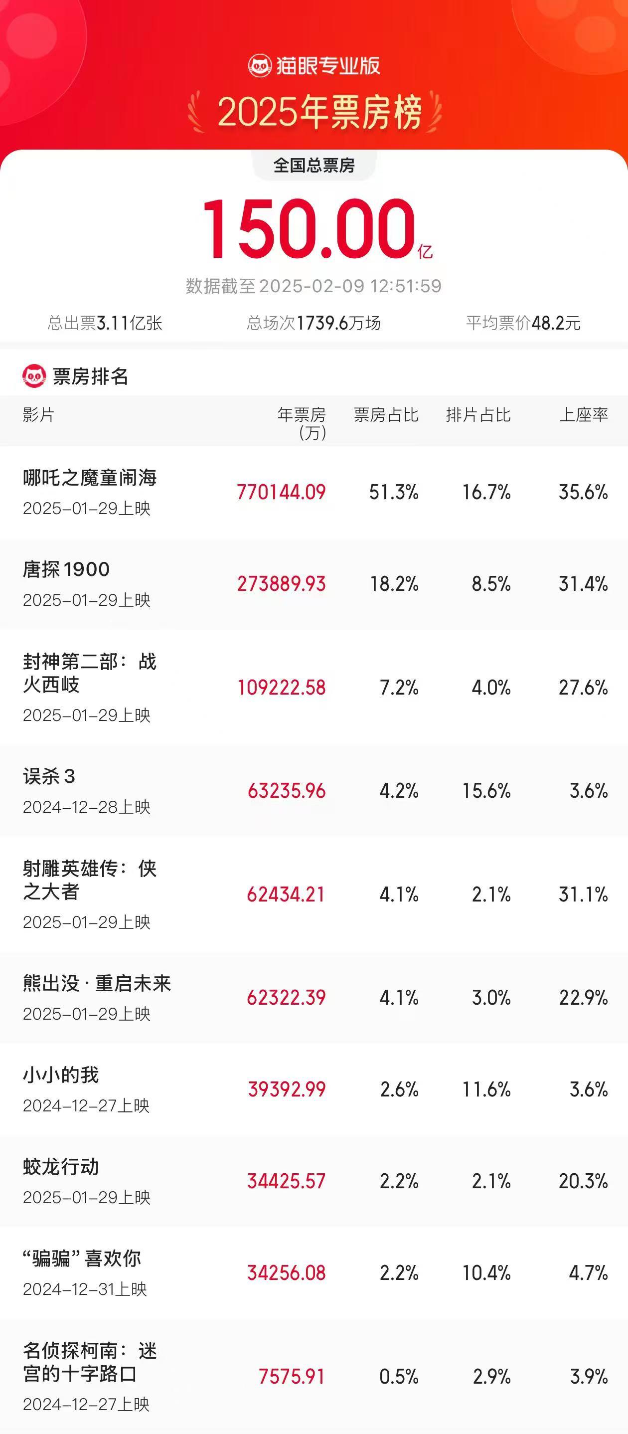 《哪吒之魔童鬧海》以超51.3%的票房占比