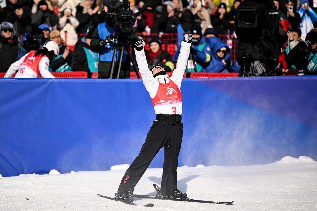 2月9日,徐夢(mèng)桃在第九屆亞冬會(huì)自由式滑雪女子個(gè)人空中技巧決賽后慶祝。新華社記者 夏一方 攝