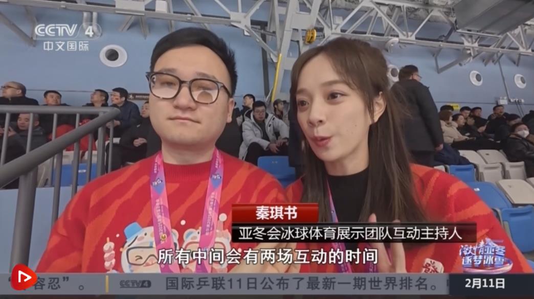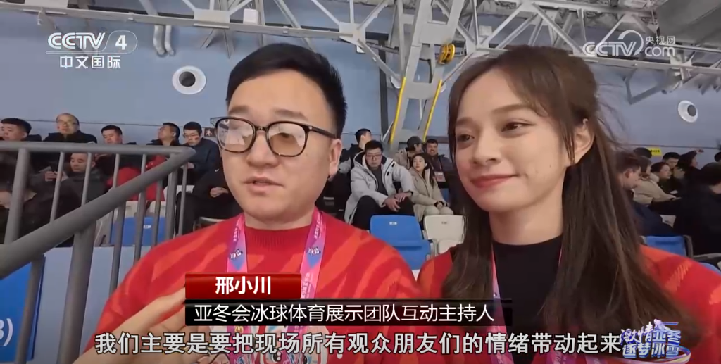 亞冬會冰球體育展示團(tuán)隊(duì)互動(dòng)主持人邢小川介紹,他們主要是帶動(dòng)所有觀眾朋友的情緒,給大家營造濃郁的現(xiàn)場氛圍,可以通過大屏幕互動(dòng),給大家?guī)砀玫挠^賽體驗(yàn)。