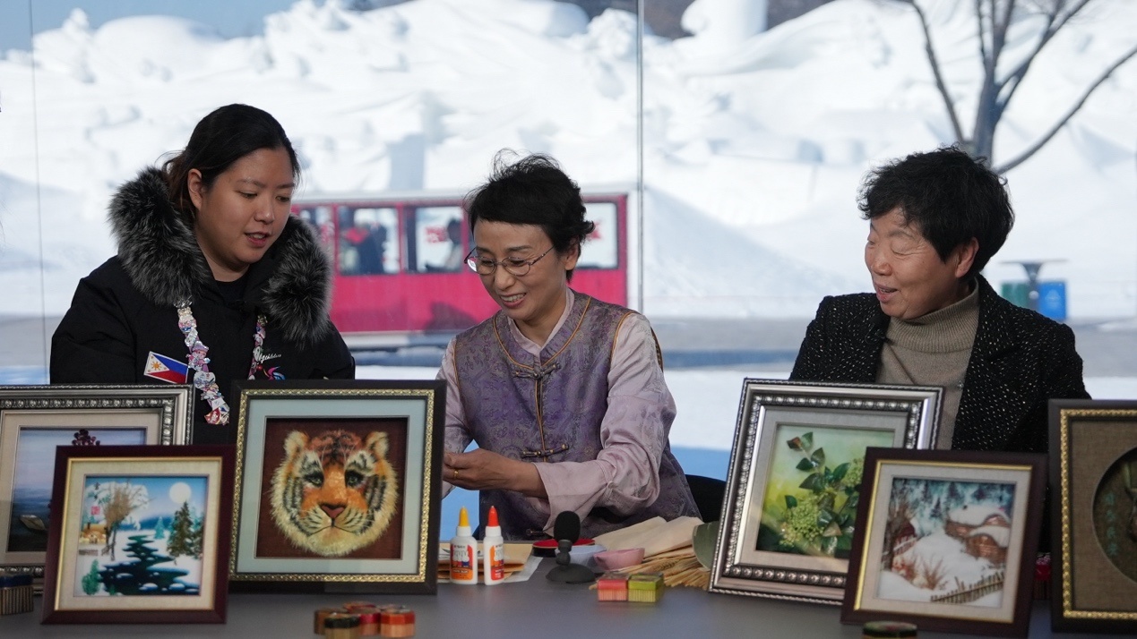 參加“當(dāng)亞冬會(huì)遇上‘非遺年’”人文交流活動(dòng)的中外嘉賓在哈爾濱太陽島雪博會(huì)CMG演播室同慶新春