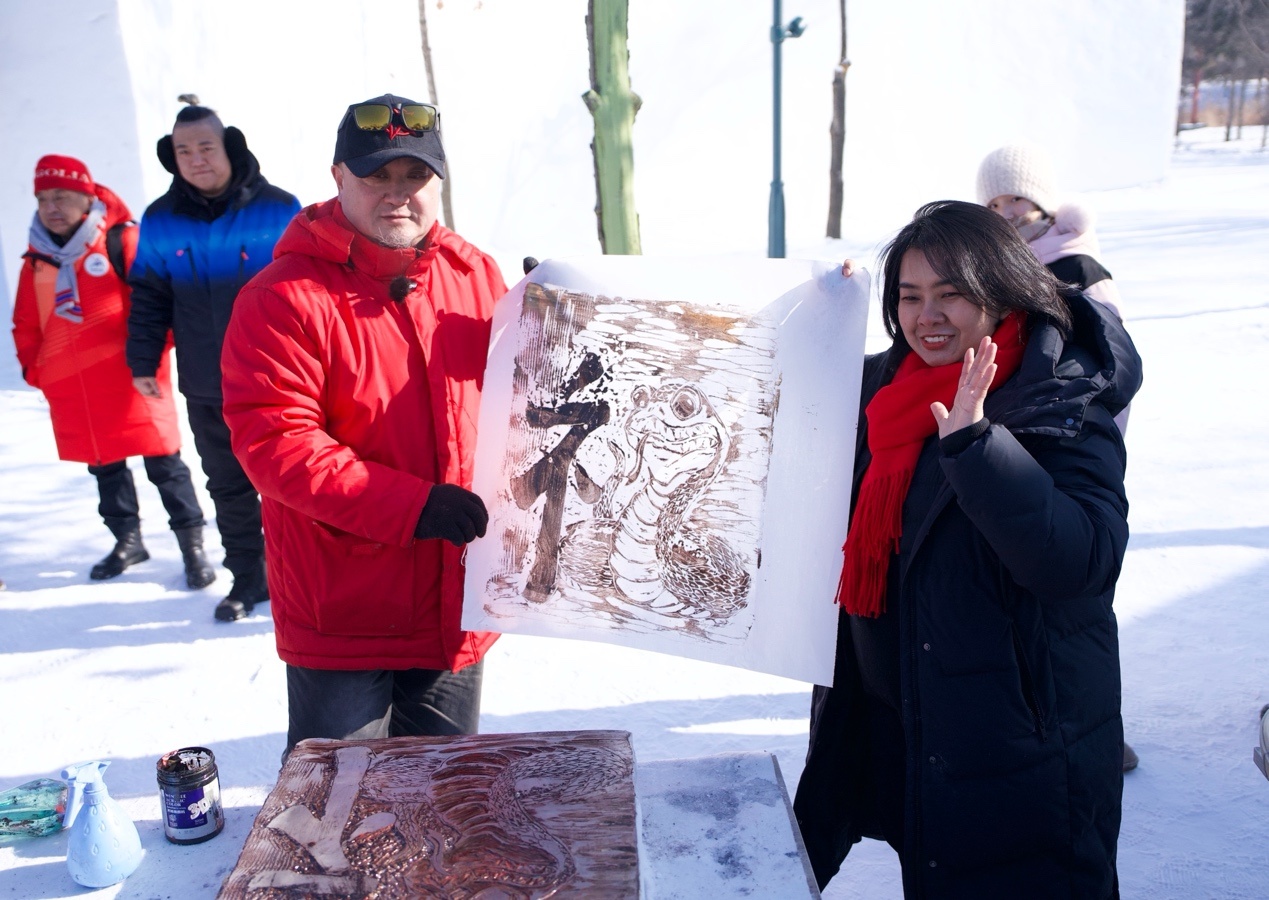 泰國(guó)駐華大使館二等秘書王安安在黑龍江省藝術(shù)研究院冰版畫研究院副院長(zhǎng)盛琰的指導(dǎo)下,制作出冰版畫《畫蛇添福》,用蛇的形狀和漢字的偏旁部首組合雕刻出漢字“?!辈⑼赜〕鰜恚耐袑?duì)中國(guó)農(nóng)歷蛇年的祝福。