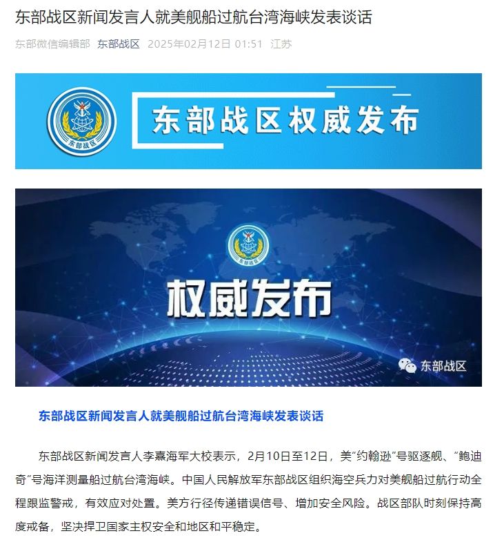 東部戰(zhàn)區(qū)新聞發(fā)言人李熹海軍大校表示,2月10日至12日,美“約翰遜”號(hào)驅(qū)逐艦、“鮑迪奇”號(hào)海洋測(cè)量船過(guò)航臺(tái)灣海峽。中國(guó)人民解放軍東部戰(zhàn)區(qū)組織海空兵力對(duì)美艦船過(guò)航行動(dòng)全程跟監(jiān)警戒,有效應(yīng)對(duì)處置。美方行徑傳遞錯(cuò)誤信號(hào)、增加安全風(fēng)險(xiǎn)。戰(zhàn)區(qū)部隊(duì)時(shí)刻保持高度戒備,堅(jiān)決捍衛(wèi)國(guó)家主權(quán)安全和地區(qū)和平穩(wěn)定。