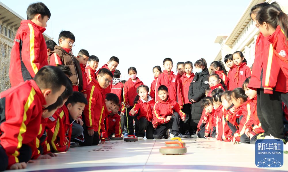 2月14日,河北省滄州市東光縣第三實(shí)驗(yàn)小學(xué)的學(xué)生們在課間參加陸地冰壺活動。新華社發(fā)(周洋攝)