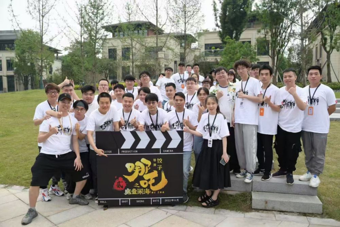 餃子導演(前排左三)和參與《哪吒之魔童鬧?!罚ā赌倪?》)制作的四川傳媒學院部分師生合影。從動畫特效、制片到配音,四川傳媒學院多位師生參與了該電影的制作(資料照片)。新華社發(fā)