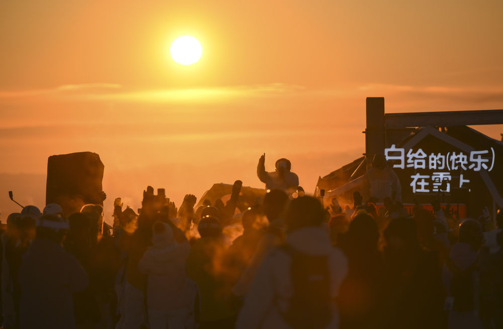 落日余暉灑在阿勒泰市將軍山國(guó)際滑雪度假區(qū)的山頂,漫山白雪被染成橙粉色。在現(xiàn)場(chǎng)電子音樂(lè)強(qiáng)勁的鼓點(diǎn)中,上千名滑雪愛(ài)好者歡呼搖擺,在零下十幾度的雪地里感受“蹦雪迪”的歡快。