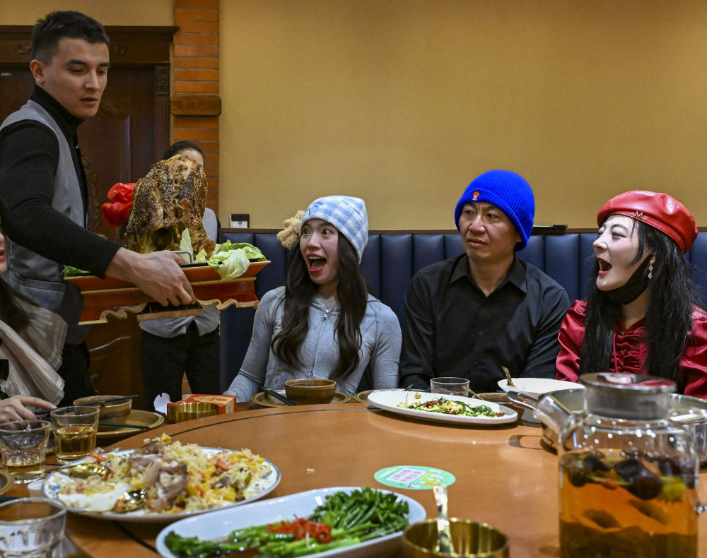 1月28日,雪友們?cè)诎⒗仗┦袇^(qū)一家餐廳吃年夜飯。新華社記者 陳朔 攝