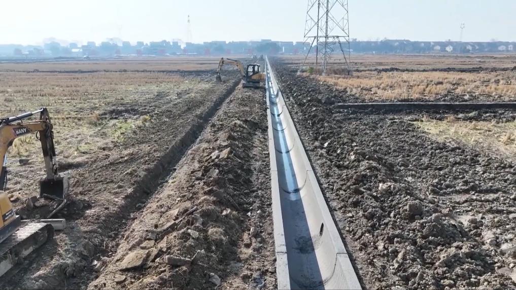 在資陽(yáng)區(qū)沙頭鎮(zhèn)富興村高標(biāo)準(zhǔn)農(nóng)田建設(shè)現(xiàn)場(chǎng),工人們正緊張有序地開挖渠道、安裝渠槽。