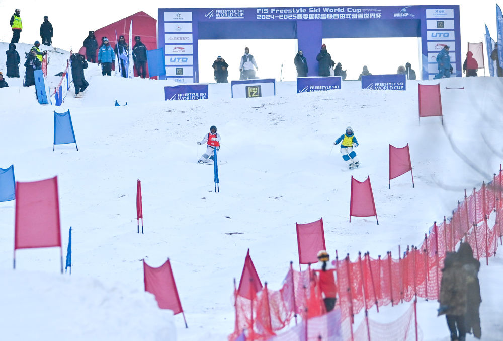 2月22日,2024-2025賽季國際雪聯(lián)自由式滑雪世界杯(北大湖站)雪上技巧女子雙人比賽在吉林市北大湖滑雪度假區(qū)舉行。新華社記者 顏麟蘊(yùn) 攝