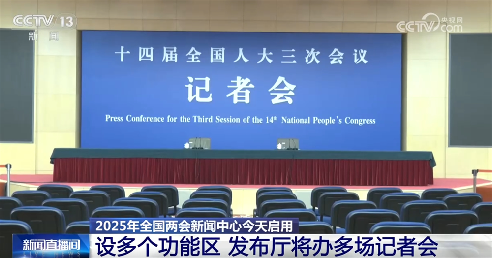 與往年相同,今年全國兩會新聞中心設置了多個功能區(qū),其中,新聞發(fā)布廳和采訪室等已經布置完畢。