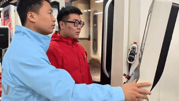 楊?。ㄗ蠖┖屯聻榭蛻?hù)展示一款行業(yè)應(yīng)用四足機(jī)器人。