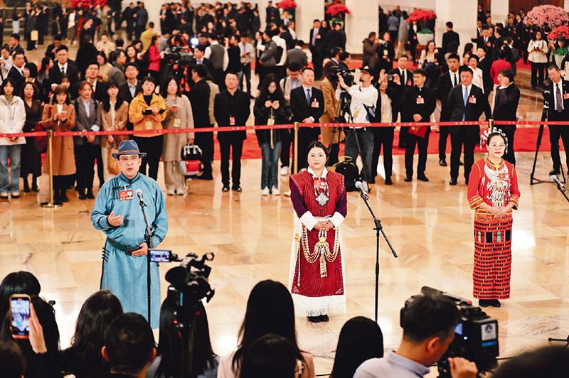 2025年3月10日,全國(guó)政協(xié)十四屆三次會(huì)議第三場(chǎng)“委員通道”在人民大會(huì)堂舉行。圖為少數(shù)民族委員亮相“委員通道”。 民族畫報(bào)記者 康夢(mèng)婷/攝