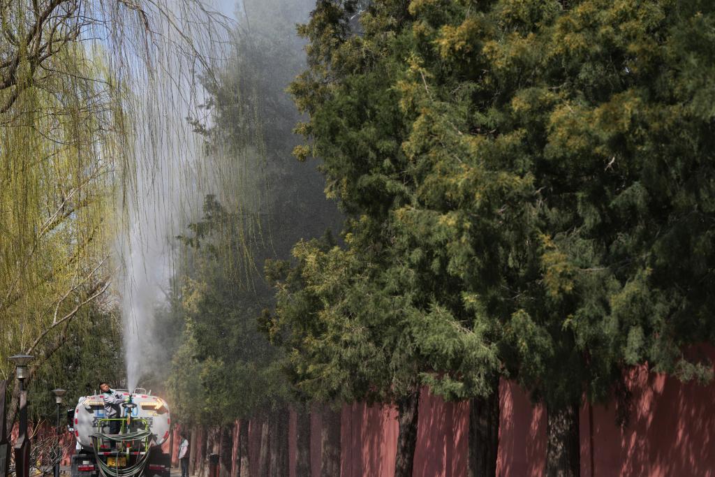記者在位于北京東四環(huán)的紅領(lǐng)巾公園里看到,一輛水車尾燈雙閃、緩緩行進(jìn),站在車上的工作人員手持高壓水槍對圓柏開展沖淋作業(yè),花粉順著水流不斷落地。另一旁,園林工作人員對開花較多的枝條進(jìn)行修剪。