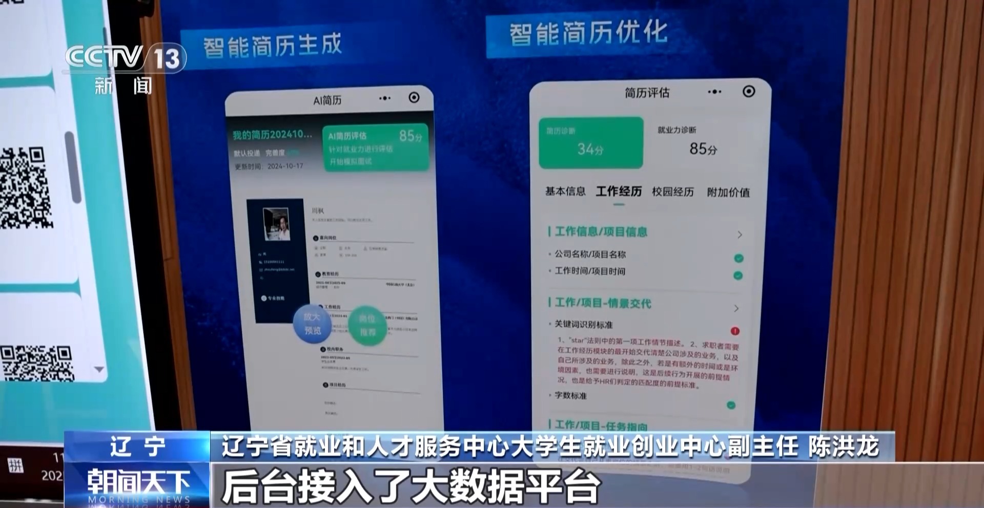 遼寧省就業(yè)和人才服務(wù)中心大學生就業(yè)創(chuàng)業(yè)中心副主任 陳洪龍:后臺接入了大數(shù)據(jù)平臺,這里面有我們的職業(yè)指導(dǎo)師和人力資源的指導(dǎo)數(shù)據(jù)大模型,優(yōu)化之后孩子們成功的概率會大大提升。