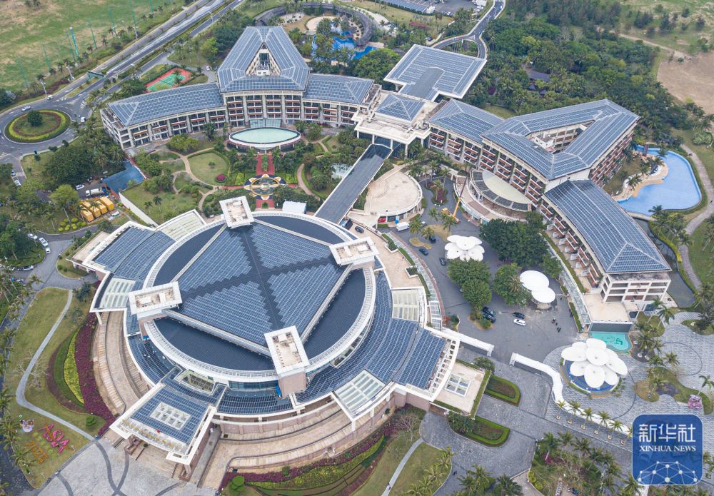 ↑ 這是在博鰲零碳示范區(qū)拍攝的博鰲亞洲論壇新聞中心及配樓屋頂?shù)墓夥O(shè)備(無人機照片,3月16日攝)。
