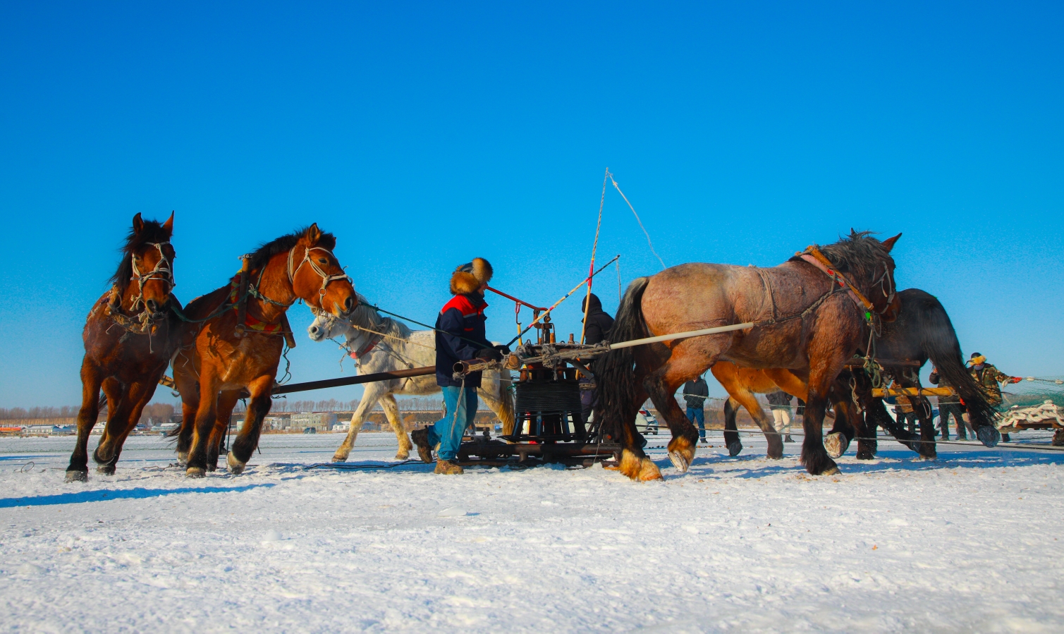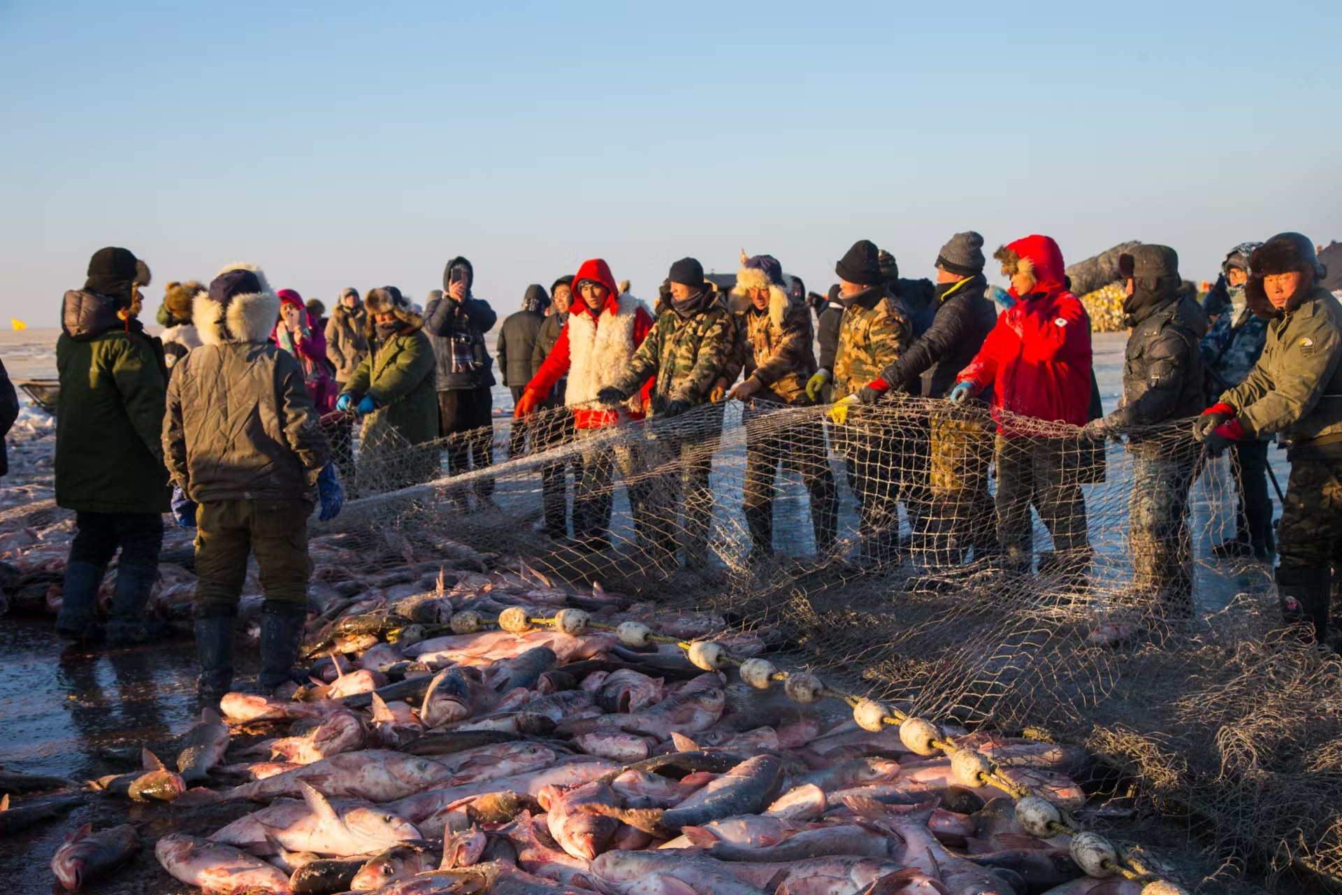 祭湖醒網(wǎng)、馬拉絞盤、冰下走網(wǎng)……一場(chǎng)冬捕盛宴正在千里冰封的查干湖上演。頭戴狐皮帽、身披羊皮襖、手持令旗的“魚(yú)把頭”一聲令下,巨大的漁網(wǎng)被緩緩從冰下拉出,隨著數(shù)萬(wàn)條活魚(yú)從水中“躍”起,“冰湖騰魚(yú)”的盛景讓傳承千年的漁獵文化在冰天雪地中再度“沸騰”。