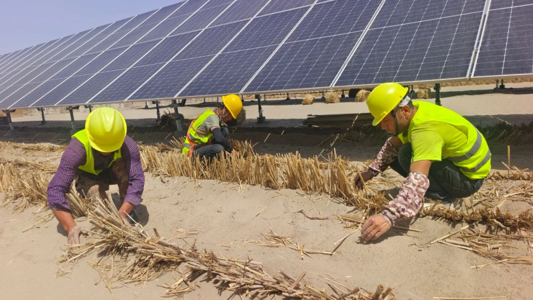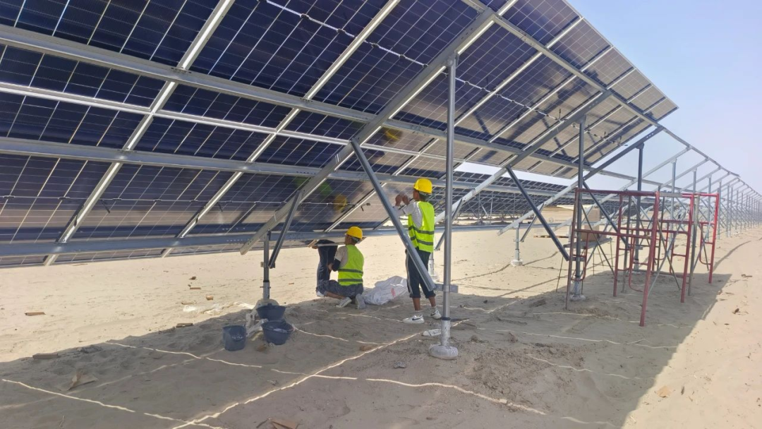 3月28日,在中國電建集團(tuán)新疆分公司新能源公司沙雅縣25萬千瓦光伏項(xiàng)目施工現(xiàn)場(chǎng),工人們正緊張地安裝光伏板,周圍草方格的鋪設(shè)及梭梭的栽種也在同步開展當(dāng)中。該項(xiàng)目施工負(fù)責(zé)人郝澤權(quán)說,光伏發(fā)電助力機(jī)電井抽取沙漠地表百米以下的微咸水灌溉梭梭林,解決了長期以來沙漠植綠缺水難題,實(shí)現(xiàn)生態(tài)與經(jīng)濟(jì)的雙重收益。