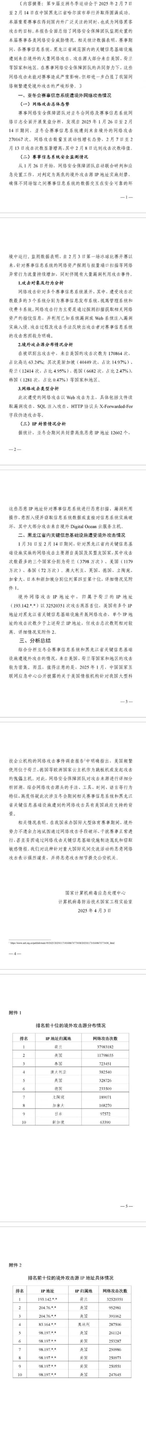 新華社哈爾濱4月3日電(記者王君寶 張建新)3日,國(guó)家計(jì)算機(jī)病毒應(yīng)急處理中心計(jì)算機(jī)病毒防治技術(shù)國(guó)家工程實(shí)驗(yàn)室發(fā)布“2025年哈爾濱第九屆亞冬會(huì)”賽事信息系統(tǒng)及黑龍江省內(nèi)關(guān)鍵信息基礎(chǔ)設(shè)施遭境外網(wǎng)絡(luò)攻擊情況監(jiān)測(cè)分析報(bào)告,內(nèi)容顯示2025年1月26日至2月14日期間,亞冬會(huì)賽事信息系統(tǒng)遭到來自境外的網(wǎng)絡(luò)攻擊達(dá)270167次。