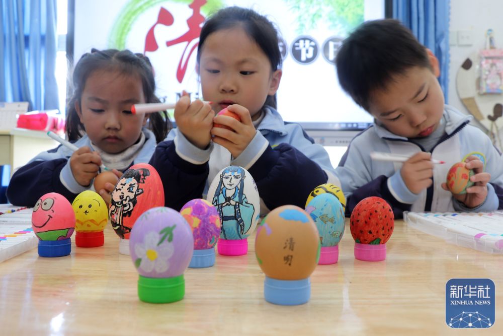 ↑ 4月1日,山東省高密市金蘋果幼兒園的孩子們在繪彩蛋。新華社發(fā)(李海濤攝)