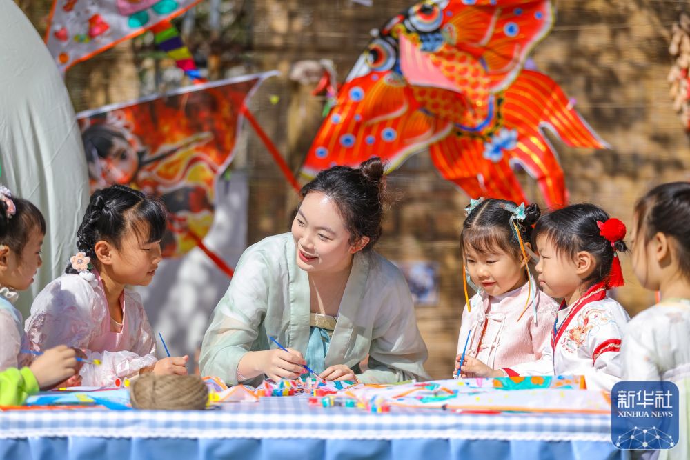 ↑ 4月2日,在山東省青島市李滄區(qū)青峰路幼兒園開展的迎清明活動中,老師指導(dǎo)小朋友繪制紙鳶。新華社發(fā)(張鷹攝)