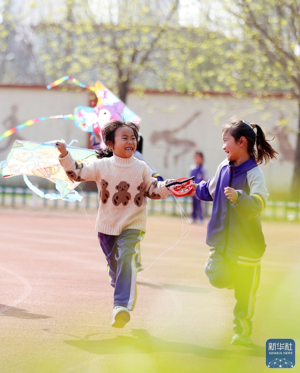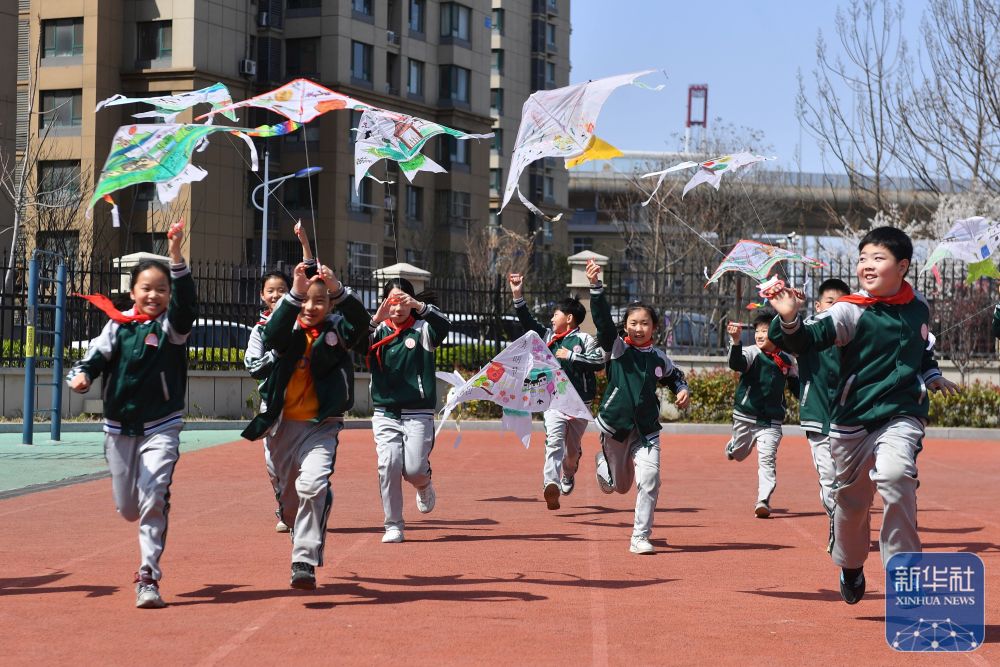 ↑ 4月3日,山東省臨沂市郯城縣第一實驗小學(xué)學(xué)生在操場上放風(fēng)箏。新華社發(fā)(張春雷攝)