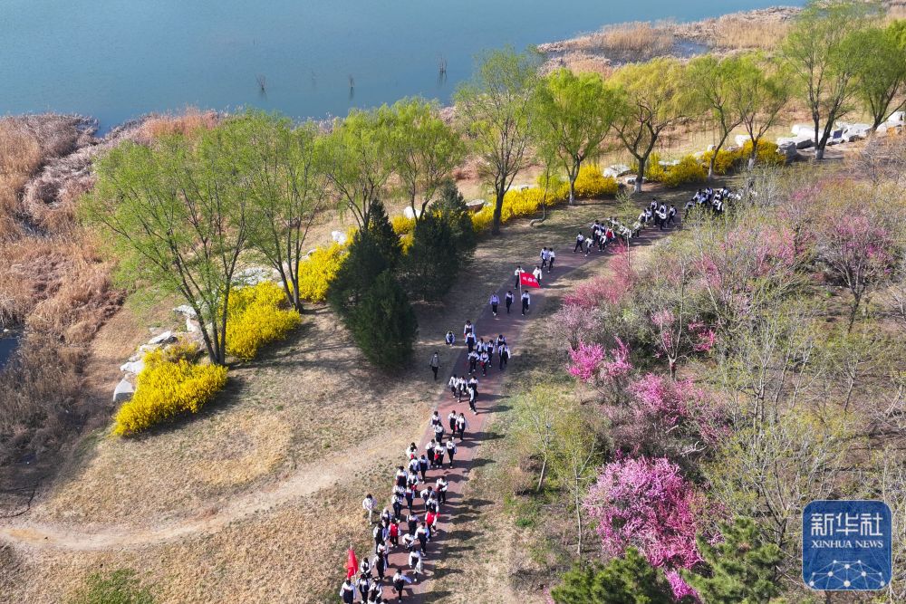 ↑ 4月3日,山東省高密市第五中學(xué)的中學(xué)生在膠河國家濕地公園參加踏青遠(yuǎn)足活動(無人機照片)。新華社發(fā)(李海濤攝)