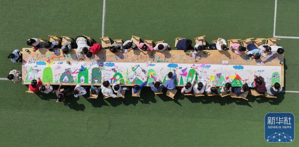 ↑ 4月3日,山東省鄒平市高新街道中心幼兒園的小朋友在繪制清明長卷(無人機照片)。新華社發(fā)(董乃德攝)