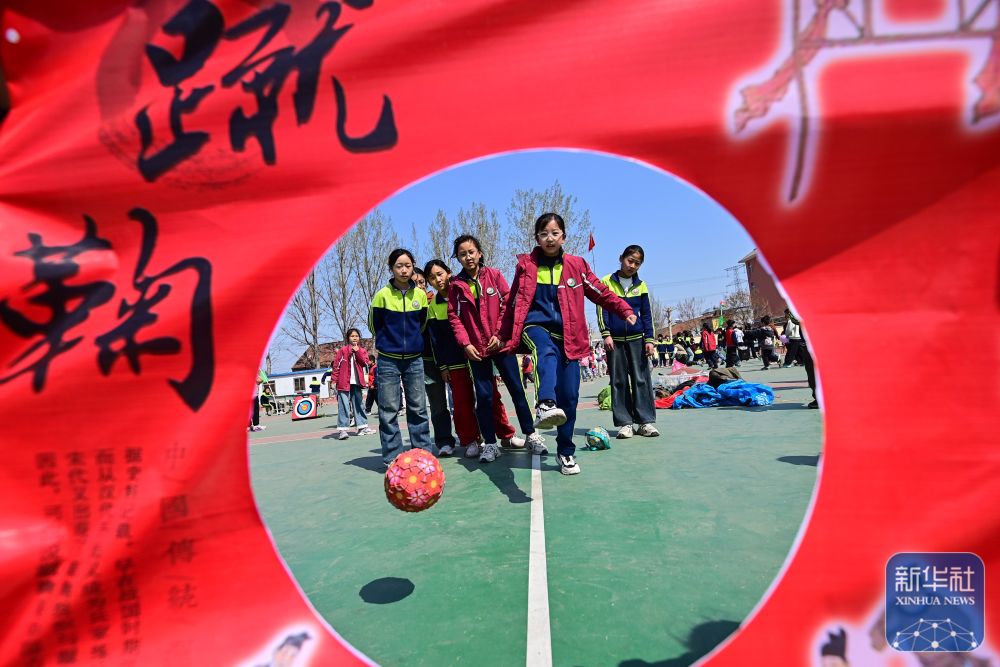 ↑ 4月3日,山東省青州市蘇埠屯學(xué)校學(xué)生體驗蹴鞠。新華社發(fā)(王繼林?jǐn)z)