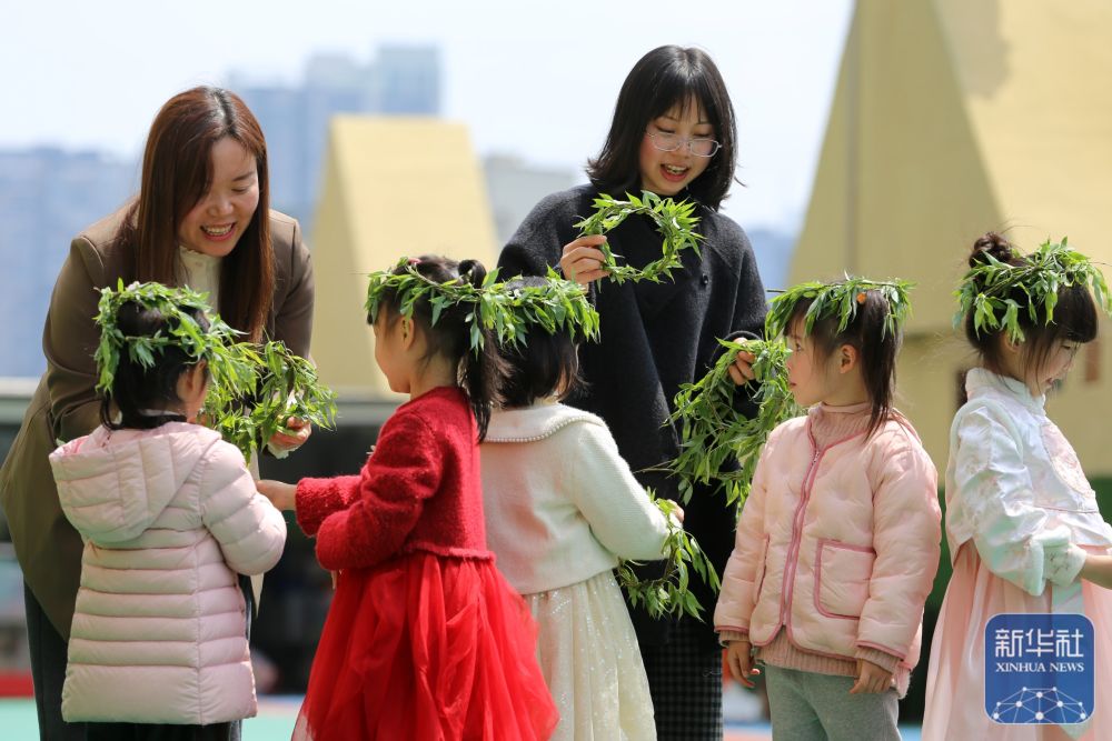 ↑ 4月2日,在山東省青島市李滄區(qū)青峰路幼兒園開展的迎清明活動中,老師指導(dǎo)小朋友編柳帽。新華社發(fā)(張鷹攝)