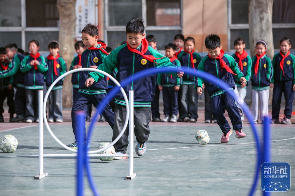 ↑ 4月3日,在河南省焦作市博愛縣清化鎮(zhèn)街道七街小學(xué),學(xué)生們在體驗蹴鞠。新華社發(fā)(程全攝)