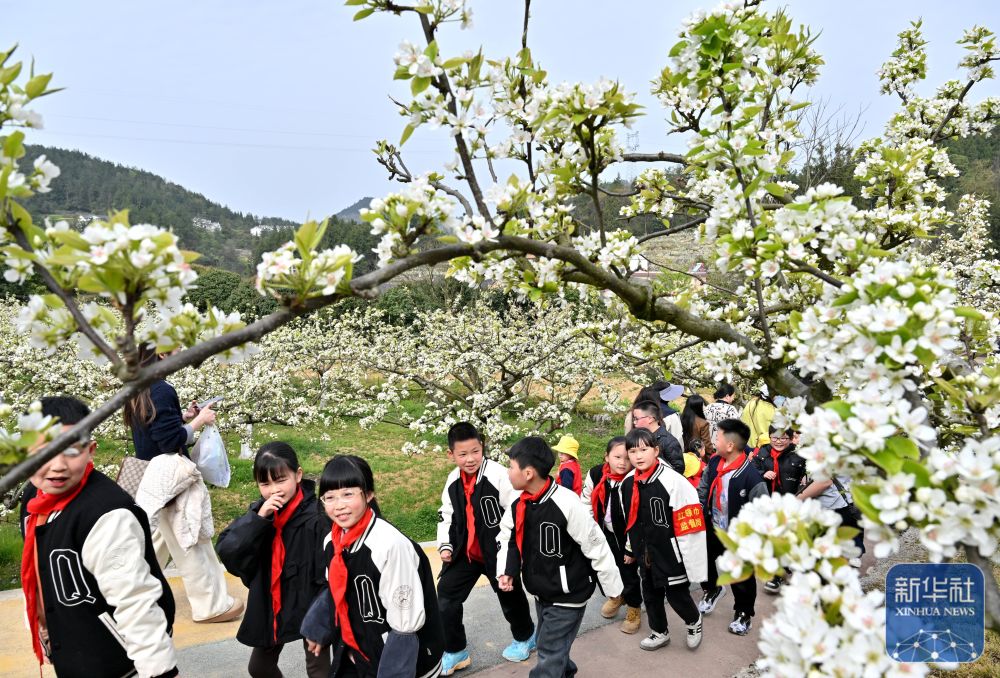 ↑ 4月2日,湖北省宣恩縣清江外國語學(xué)校的師生在黃坪村的梨園里徒步。新華社發(fā)(宋文攝)