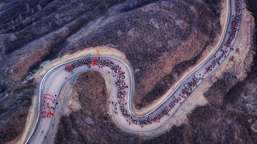 4月3日,參加徒步祭英烈活動的師生在翻越黃峁山(無人機照片)。