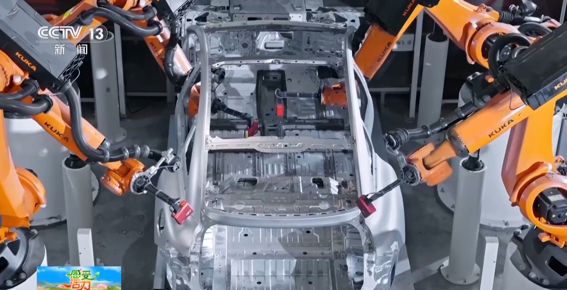 超級工廠制造部副部長 張東臣:我們整個沖壓是通過6700噸的沖壓機,每個零件從生產(chǎn)到完成是3.75秒,也就是說一分鐘可以生產(chǎn)16個部件。焊裝的主線全自動化率100%,現(xiàn)在是兩分鐘下線一臺車身。這條生產(chǎn)線有527個機器人在同步作業(yè),搬運、涂膠、焊接、鉚接、檢測,機械手臂無處不在。