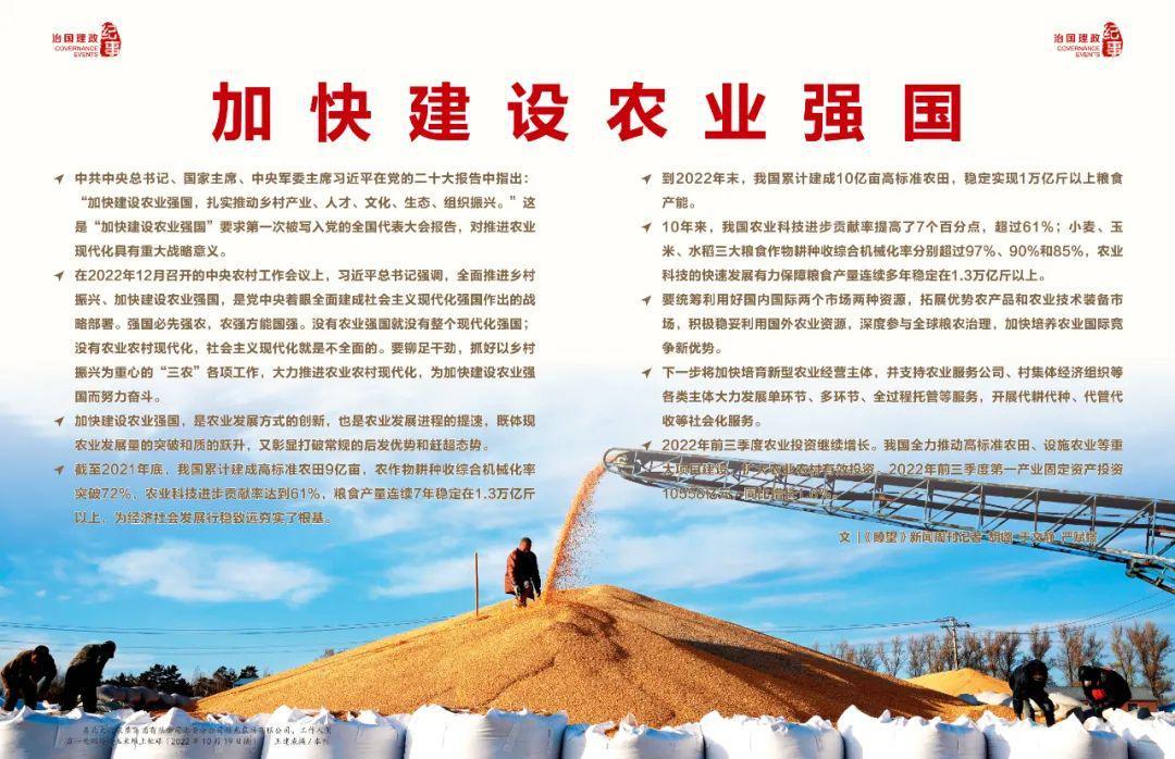 ◆ 中共中央總書記、國(guó)家主席、中央軍委主席習(xí)近平在黨的二十大報(bào)告中指出:“加快建設(shè)農(nóng)業(yè)強(qiáng)國(guó),扎實(shí)推動(dòng)鄉(xiāng)村產(chǎn)業(yè)、人才、文化、生態(tài)、組織振興?!边@是“加快建設(shè)農(nóng)業(yè)強(qiáng)國(guó)”要求第一次被寫入黨的全國(guó)代表大會(huì)報(bào)告,對(duì)推進(jìn)農(nóng)業(yè)現(xiàn)代化具有重大戰(zhàn)略意義。
