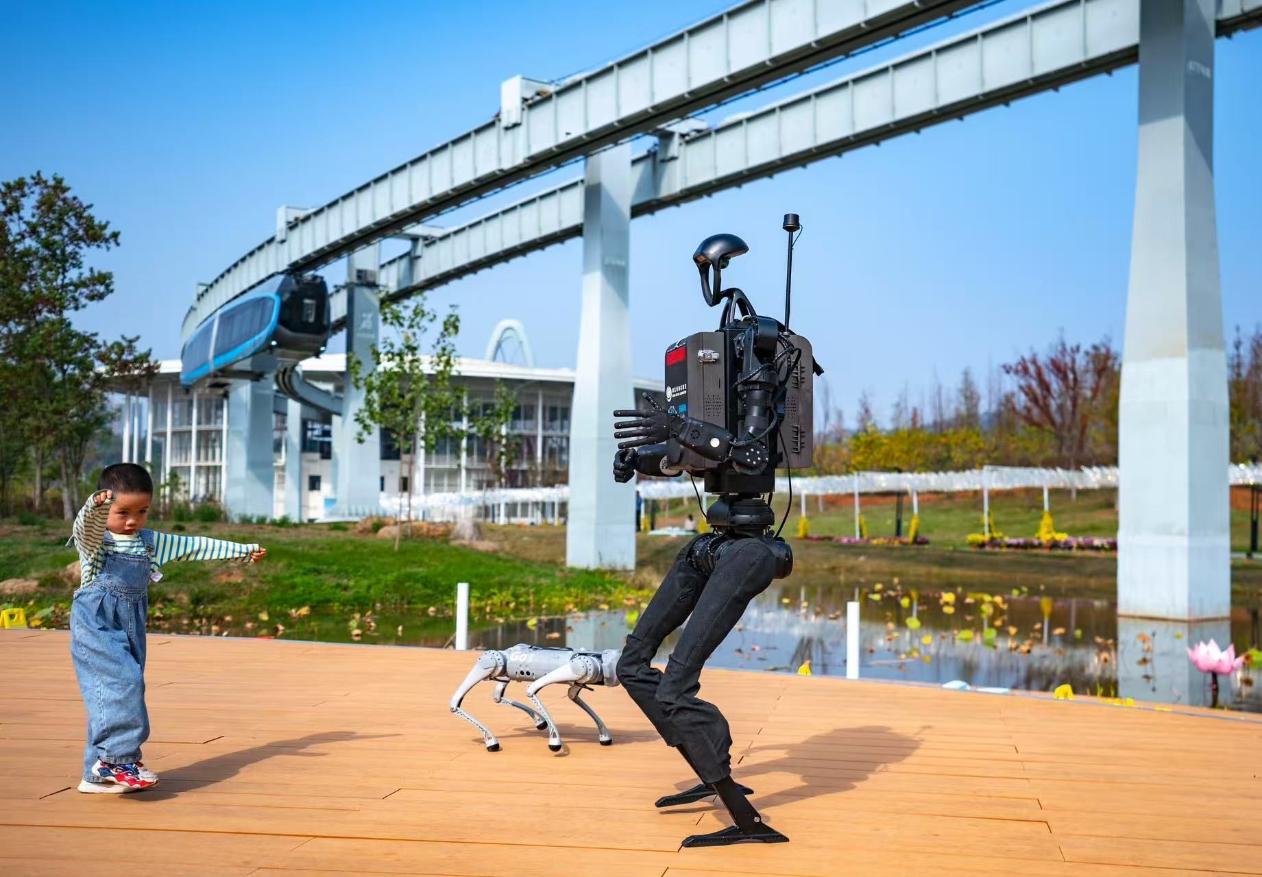 在武漢東湖高新區(qū)空軌高新大道站,一輛空軌列車正在駛過(guò);生態(tài)大走廊上,裝載了光谷造“大腦”的人形機(jī)器人和四足機(jī)器狗,正與看AI展的小朋友斗舞。